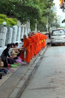 Velice brzy se tu vstává. Lidé jsou tu na nohou už po páté hodině, ve městech s chrámy se tu za úsvitu dávají almužny mnichům. Ti chodí ve špalíru a klečící lidé jim sypou do speciální mísy rýži, ovoce, sladkosti i maso. Ve městech, kde chrámy nejsou, přesto stávají stejně brzy.