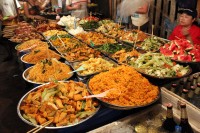 slova vše, co se hýbe. Prasata, krávy, kuřata a ryby jsou samozřejmostí. Stejně samozřejmé je tu bůvolí, kozí a kachní maso. V Thajsku již ochutnané červy, cvrčky a jiný hmyz tu také není problém najít. To ale není všechno. Tady máte možnost ochutnat i gekony, leguány, žáby, hady a různé hlodavce, ať už malé jako krysy nebo větší jako jezevce. Bohužel (a možná i bohudík), já tu kromě žab nic neochutnal. Nějak nebyla chuť nebo co.