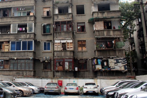 i taková je Čína - moderní auta před zuboženým činžákem