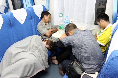 Noční přesun na sedadlech ve vlaku